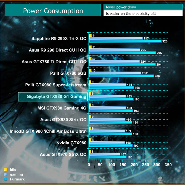 All of the GTX980 cards we have tested are very efficient. Gigabyte's GTX980 G1 Gaming takes 163 watts under gaming load.