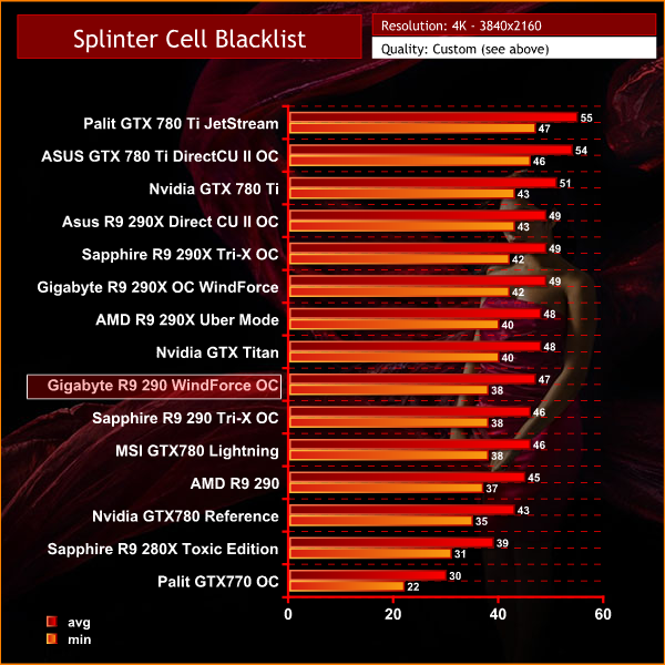 Splinter Cell Blacklist looks great at Ultra HD 4K, and the Gigabyte R9 290 WindForce OC has enough power to maintain a +35 frame rate throughout the test.