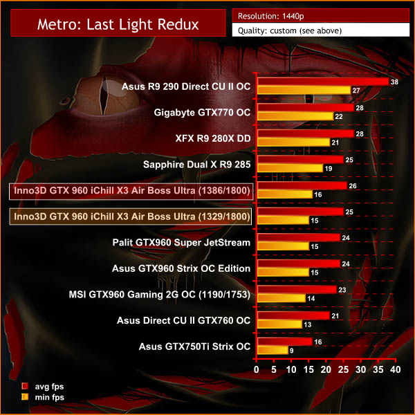 On May 22, 2014, a Redux version of Metro Last Light was announced. It was released on August 26, 2014 in North America and August 29, 2014 in Europe for the PC, PlayStation 4 and Xbox One. Redux adds all the DLC and graphical improvements. A compilation package, titled Metro Redux, was released at the same time which includes Last Light and 2033. (Wikipedia). We test with following settings: quality high, SSAA on, 16AF, Tessellation normal.