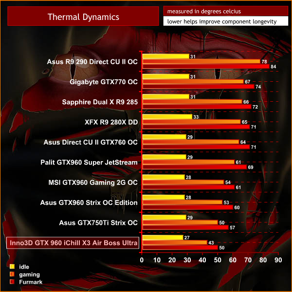 These are simply incredible results. The Inno3D GeForce GTX 960 iChill X3 Air Boss Ultra is by far the coolest running GTX960 we have tested. The previous leader, the Asus GTX960 Strix OC Edition runs 10c hotter!