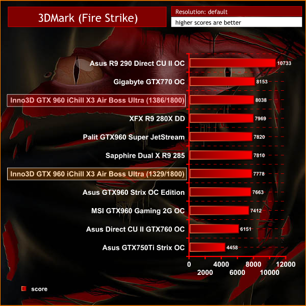 Out of the box speeds are very good, but when we overclock the Inno3D GeForce GTX 960 iChill X3 Air Boss Ultra to the limits we can see it isn't too far away from the Gigabyte GTX770 OC.