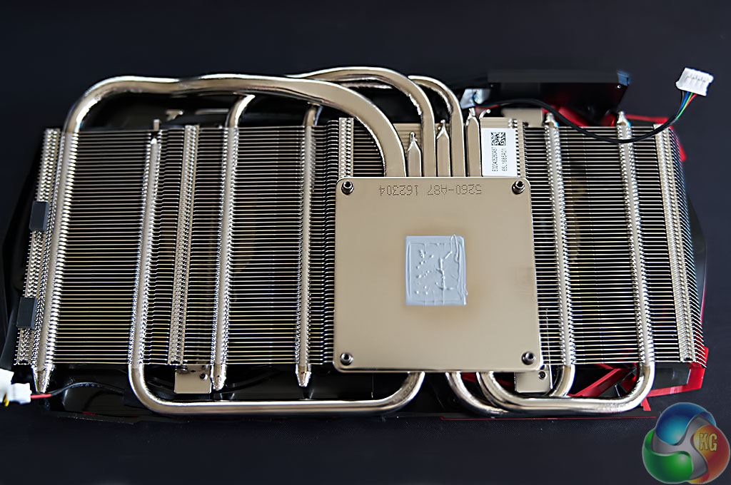 The Twin Frozr VI cooler is formidable. It comprises a series of nickel plated copper heatpipes ranging in size from 6mm to 8mm. These heatpipes run into two separate racks of aluminium fins on either side of the core. MSI have not opted for a direct touch heatpipe heatsink design on this card. The copper heatsink baseplate is solid nickel plated and is polished to a high finish. This is a great looking cooling system.