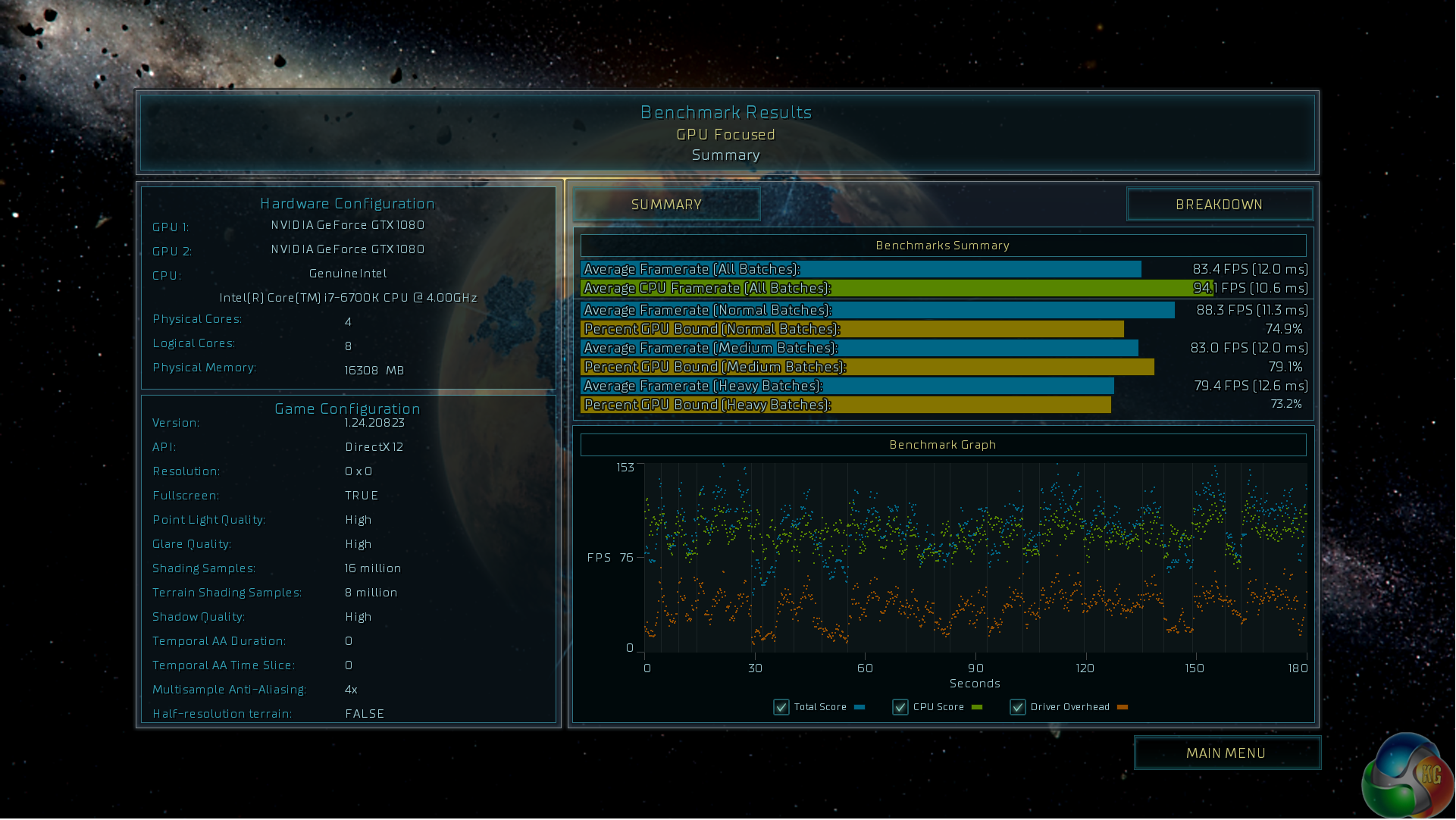At 1080p in the Direct X 12 game, the MSI GTX 1080 Gaming X 8G takes a position behind the Gigabyte GTX 1080 G1 Gaming. When two cards are in the system, the average frame rate increases to 83.4.