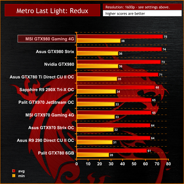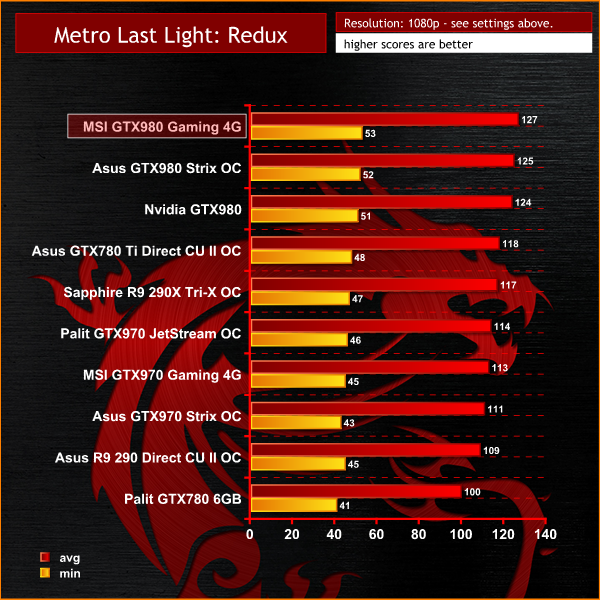 On May 22, 2014, a Redux version of Metro Last Light was announced. It was released on August 26, 2014 in North America and August 29, 2014 in Europe for the PC, PlayStation 4 and Xbox One. Redux adds all the DLC and graphical improvements. A compilation package, titled Metro Redux, was released at the same time which includes Last Light and 2033. (Wikipedia). We test with following settings: Quality-Very High, SSAA-off, Texture Filtering-16x, Motion Blur-Normal, Tessellation-Normal, Advanced Physx-On.