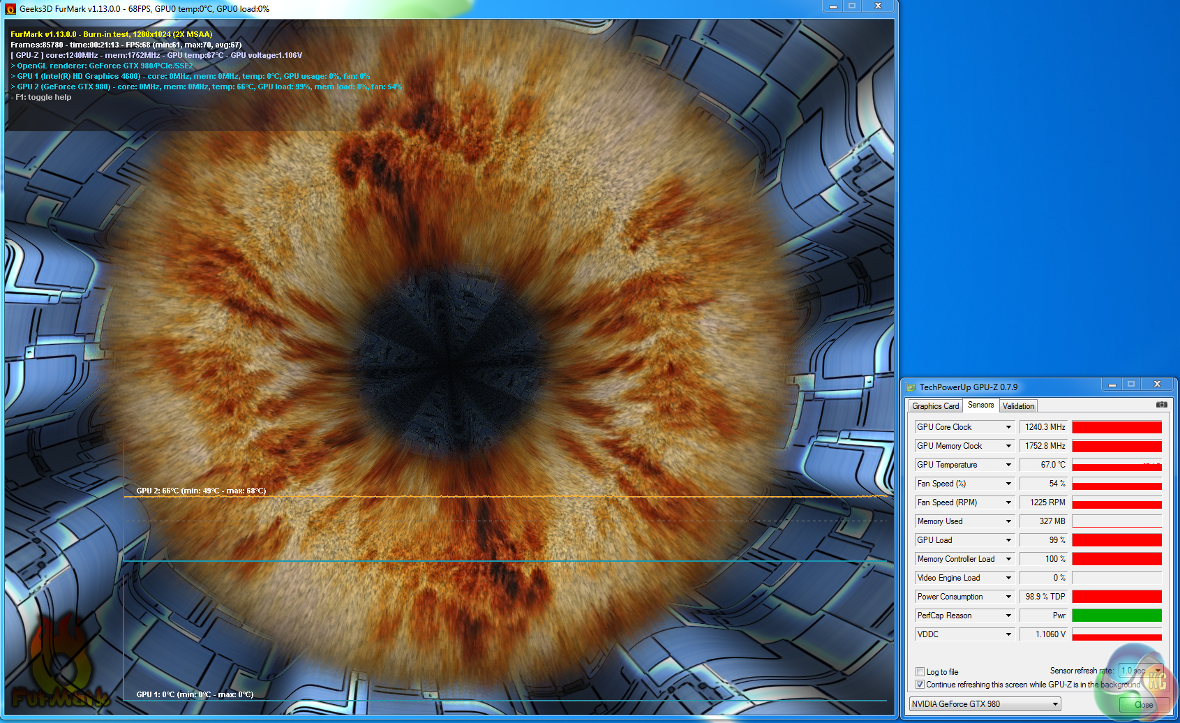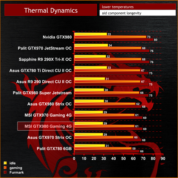 MSI's Hybrid Frozr cooler is exceptionally good, holding a gaming temperature around 60c. We recorded 1c improved performance over the Direct CU cooler on the Asus GTX980 Strix.