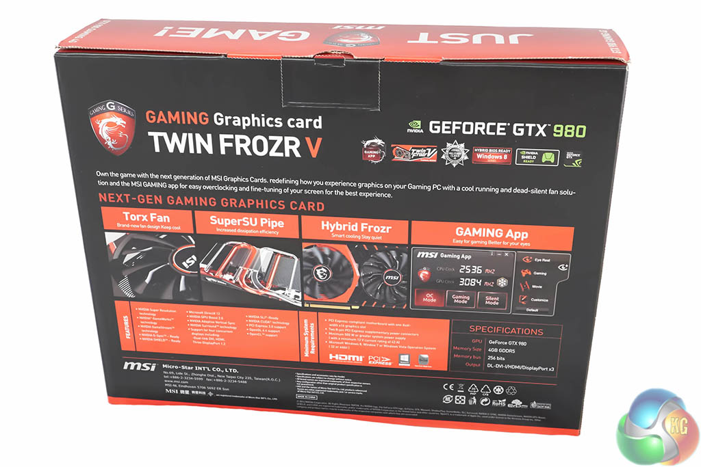 The GTX980 is built on the 28nm process. It has 2,048 Cuda Cores, 64 ROP’s and 128 Texture units. The 4GB of Samsung GDDR5 is running at 1,753mhz (7 Gbps effective) and is connected via a 256bit memory interface. The core clock speed has been increased by MSI to 1,216mhz with a boost speed set at 1,317mhz.