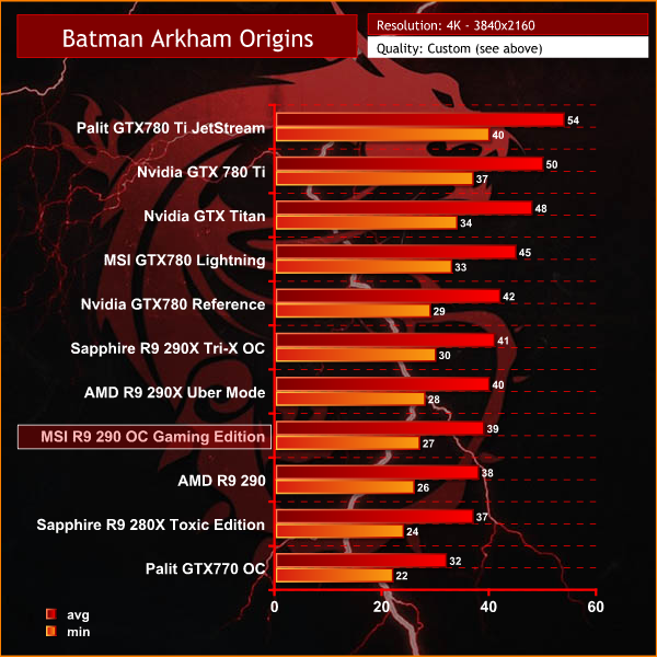 The Palit GTX780 Ti Jetstream is way out in first position, followed by the reference clocked GTX780 Ti and GTX Titan. The MSI R9 290 OC Gaming Edition averages 39 frames per second, dropping to 27 a couple of times during our test run.