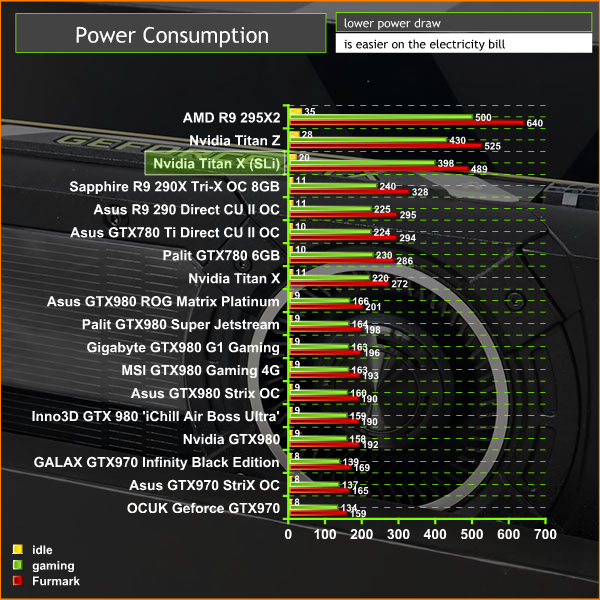 Considering the performance of the Titan X, the power demand under load when gaming, is very impressive. It demands 10 watts less under load, than the Palit GTX780 6GB we tested.