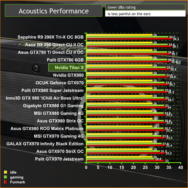 The Titan X is using a reference Nvidia cooler, which while not quite at the same level as modified solutions from Nvidia partners, handles the task reasonably well. We wouldn't say this was the quietest card we have ever tests, however fan noise is not that intrusive.