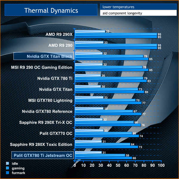 We can see the advantages of the massive cooler fitted to the Palit GTX 780 TI Jetstream OC. Interestingly this sample of the card runs around 7c cooler than the previous version we got for review last year ! The Nvidia GTX Titan Black under gaming load runs just below 80c, rising to 85C when tasked with the synthetic Furmark benchmark.