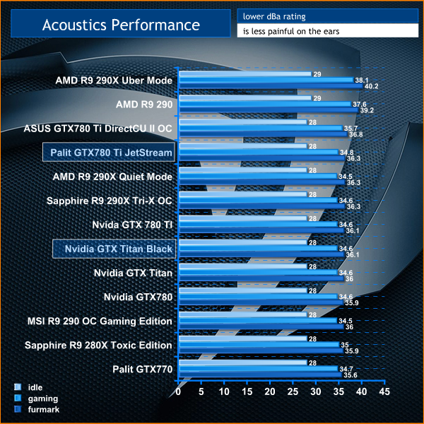 Both cards can be heard under load, although they are not intrusive. The Titan Black has a slight edge in regards to noise emissions, although when we look at the running temperatures on the last page we can see that the Palit GTX780Ti Jetstream card runs around 20c cooler under load. This is a massive difference.