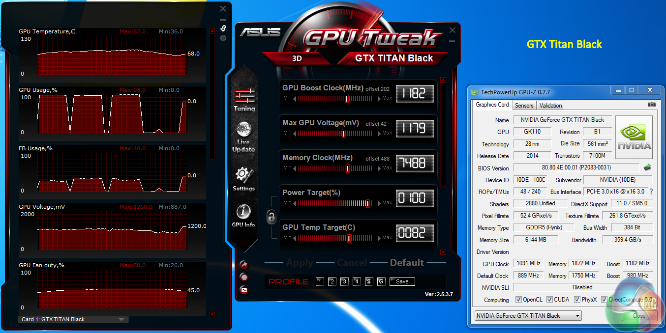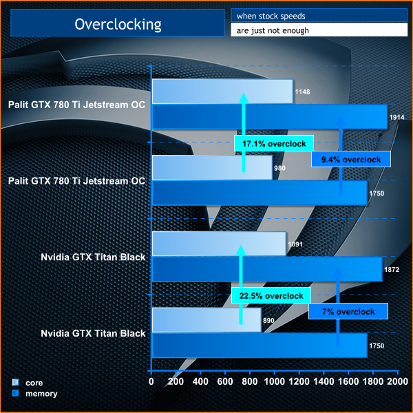 To overclock today, we used the latest version of ASUS GPU Tweak with the Titan Black and Palit's own overclocking software with their GTX780 Ti Jetstream OC.