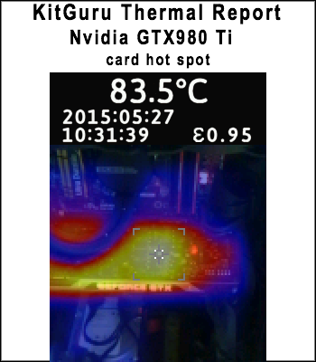 We install the graphics card into our system and measure temperatures on the back of the PCB with our Fluke Visual IR Thermometer/Infrared Thermal Camera. This is a real world running environment.