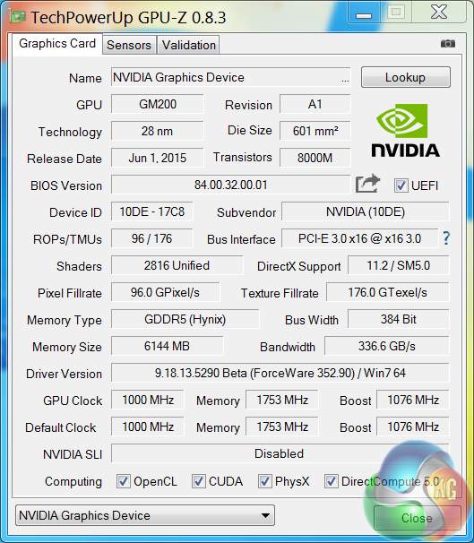 An overview of the hardware in the latest version of GPUz – as discussed on the previous page. The GM200 core runs at 1,000mhz (1,076mhz boost) and is built on the 28nm process. The GTX980 Ti has 96 ROPs, 176 Texture units (Titan X has 192 texture units) and 2,816 CUDA Cores (Titan X has 3,072 CUDA Cores). The 6GB of GDDR5 memory runs at 1753mhz (7Gbps effective) and is connected via a 384 bit memory interface.