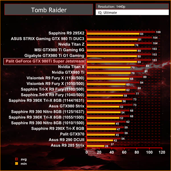 Tomb Raider is powered by a fully featured engine. The overclocked GTX980 Ti has no problems powering this game at 1440p, averaging over 100 frames per second.