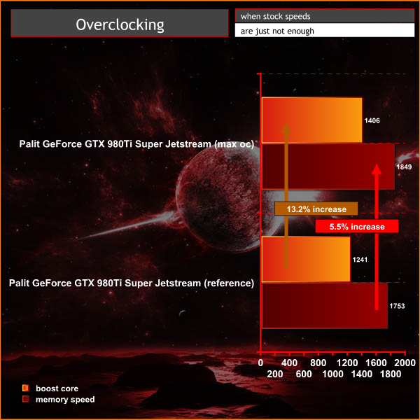 We managed to increase the boost speeds from 1,241mhz to 1,406mhz – a 13.2% overclock. Memory could be pushed from 1,753 mhz (7Gbps effective) to 1,849mhz (7.4Gbps effective)