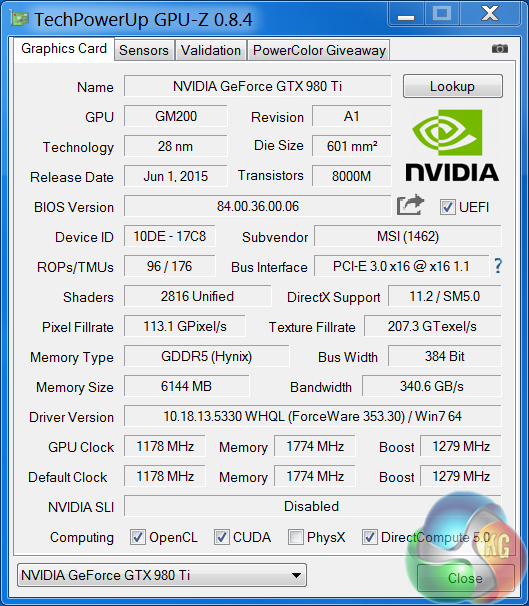 MSI GTX980 Ti Gaming 6G (1,178 mhz core / 1774 mhz memory)