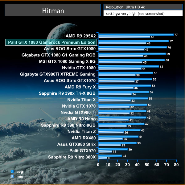 At Ultra HD 4K the AMD R9 295X2 takes top position, although the Palit GTX 1080 GameRock Premium Edition commands second place, ahead of other GTX1080 cards.