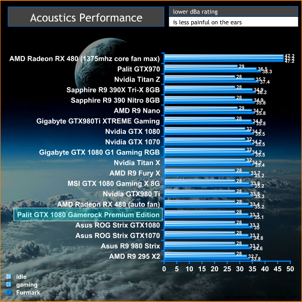 The triple slot cooler with dual fans proves very effective. The Palit GTX 1080 GameRock Premium Edition is very quiet under gaming load, basically inaudible behind a couple of case fans. We did not notice any coil whine during our review, which is good to note.