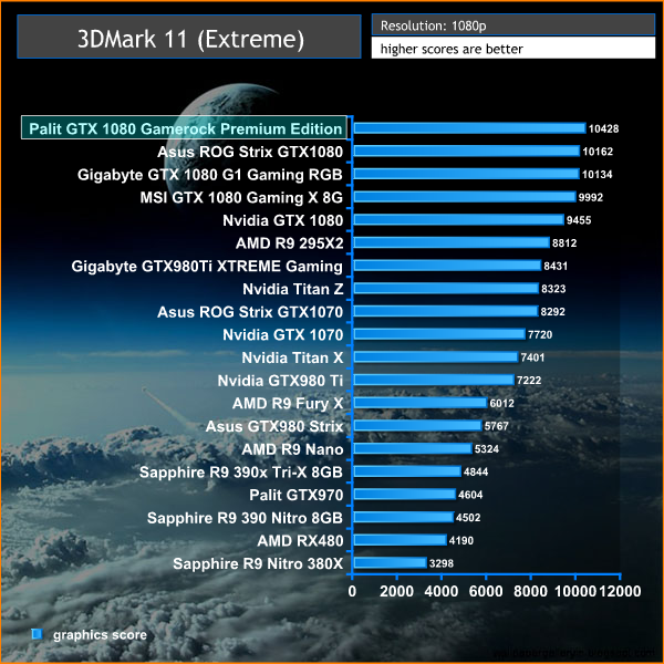 Staggering performance from the Palit GTX 1080 GameRock Premium Edition, topping the chart, even ahead of the ASUS ROG Strix GTX1080.