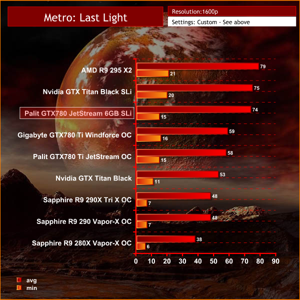 The Titan Black SLi configuration is very closely matched to the Palit GTX780 JetStream 6GB in this test. The AMD R9 295X2 takes top position, by a clear margin.