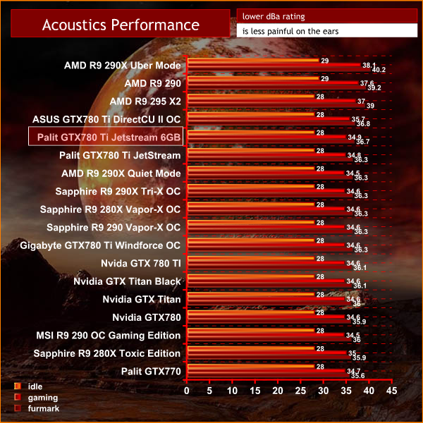 We measure from a distance of around 1 meter from the closed chassis and 4 foot from the ground to mirror a real world situation. Ambient noise in the room measures close to the limits of our sound meter at 28dBa. It isn’t a real world situation to be measuring with a case panel off only a few centimeters away from a video card. Our noise figures may therefore be lower than other publications who record at closer distances, or without a fully closed case muting the noise.