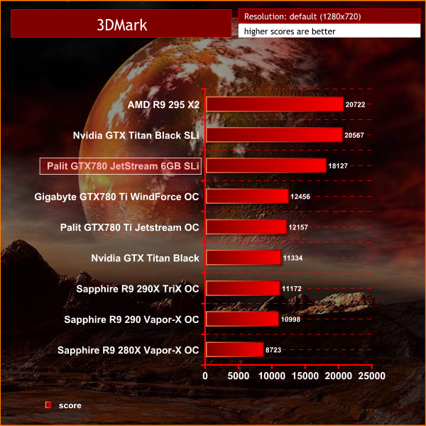 The Palit GTX780 JetStream 6GB cards in SLi score around 2,000 points less than the GTX Titan Black in SLi. AMD's R9 295 X2 claims top position, although it is very closely matched.