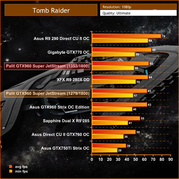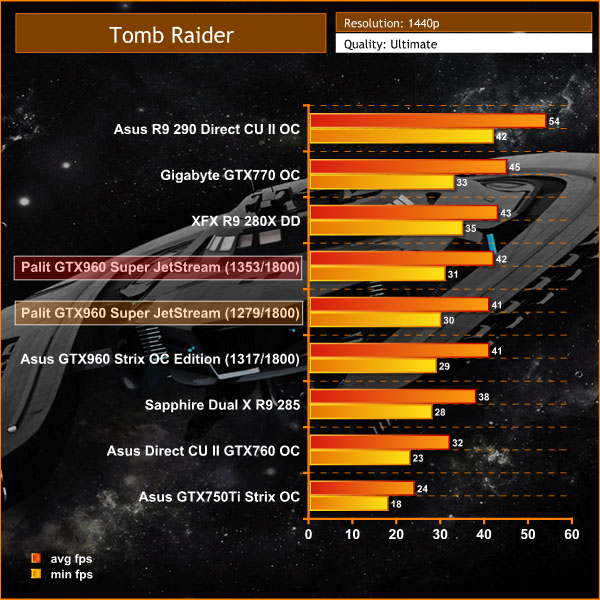 The Palit GTX960 Super JetStream maintains playable frame rates at both 1080p and 1440p resolutions.