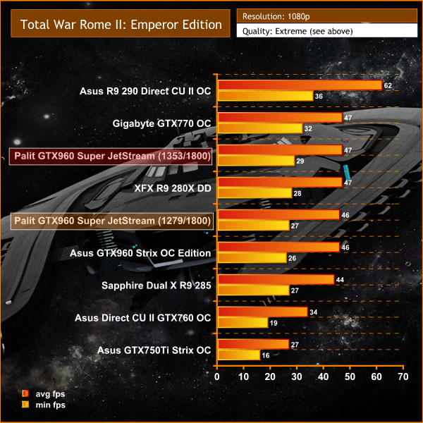 The Asus GTX960 Strix OC manages to hold smooth frame rates (above 25fps) throughout this test, although ideally if you want a solid 30fps+ you would need to pay a little extra money for a more powerful solution such as the GTX770OC, or R9 290.