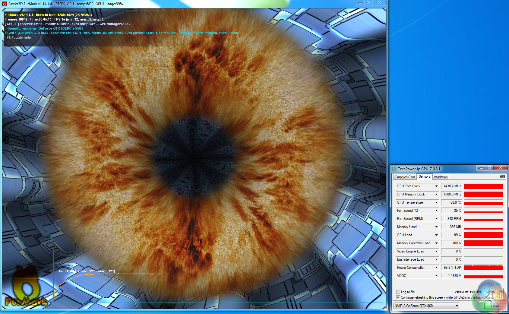 The Maxwell architecture shines in this test although I was surprised to see the Palit card running quite a bit hotter than the ASUS GTX960 Strix OC Edition, between 8 and 9 degrees Celsius which is certainly noticeable.