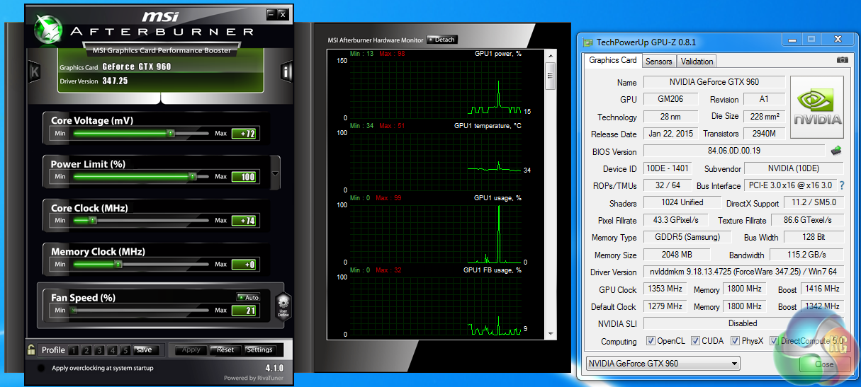 As the majority of our readers are likely to buy a GTX960 to run in a highly overclocked state, we felt we would break with tradition and get the overclocking section out of the way, first. Throughout this review we will run all tests with the Palit GTX960 Super JetStream in its ‘out of box' state, and with our final maximum overclocked tweaked settings.