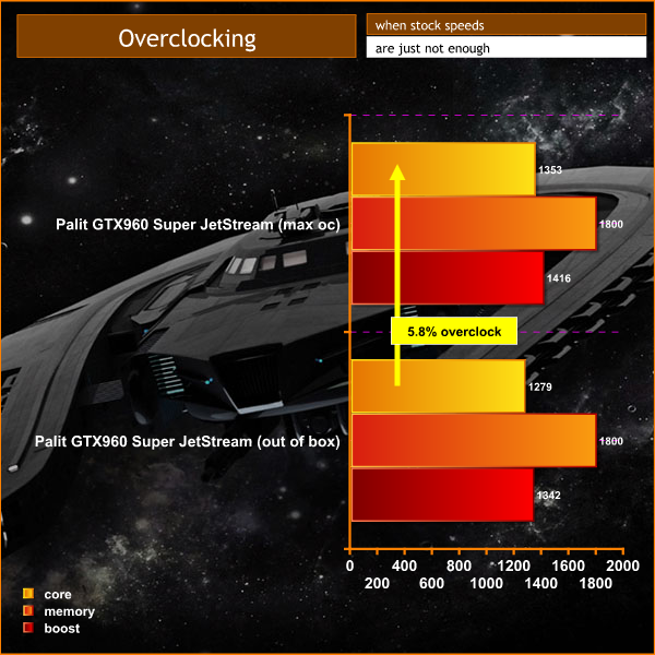 To be fair to Palit, they have already overclocked the GM206 core by 13.7%, so our additional 6% translates into a total of 20% extra over the reference Nvidia design.