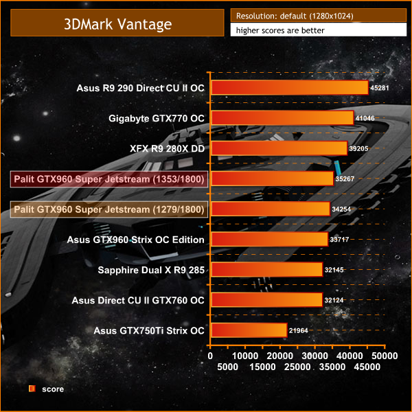 The Palit GTX960 Super JetStream scores 34,254 points at the out of the box speeds.