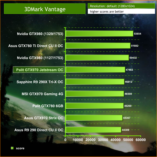 Futuremark released 3DMark Vantage, on April 28, 2008. It is a benchmark based upon DirectX 10, and therefore will only run under Windows Vista (Service Pack 1 is stated as a requirement) and Windows 7. This is the first edition where the feature-restricted, free of charge version could not be used any number of times. 1280×1024 resolution was used with performance settings.
