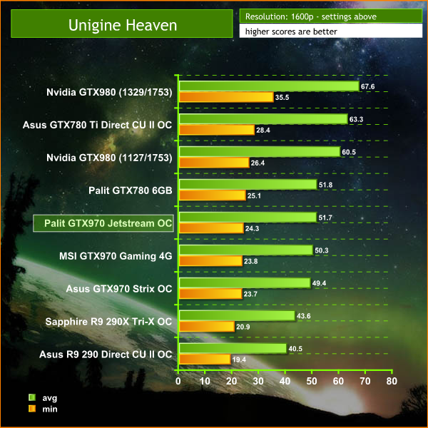 Performance from the Palit GTX970 JetStream OC is very closely matched with the Palit GTX780 6GB – only a tenth of a frame worse actually.