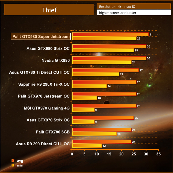 A super demanding engine at 4k. If you take the view that 25 frames per second is the ‘cut off' point for acceptable motion, then an overclocked GTX980 solution is the only single GPU to deliver playable frame rates.