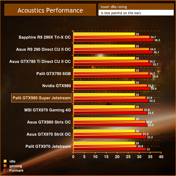 All of the GTX980 cards are quiet, and the Palit GTX980 Super JetStream is no different. Under gaming load you would be hard pressed to even hear the fans running, unless you had the case door open and no other fans in the build.