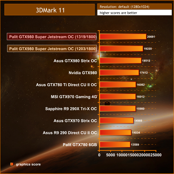 The additional overclock on the core helped to push performance further – the score in 3DMark 11 increased from 19,220 points to 20,691 points.