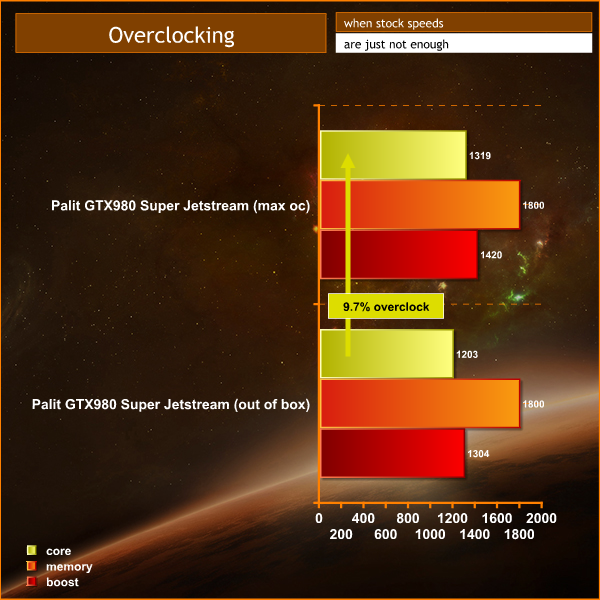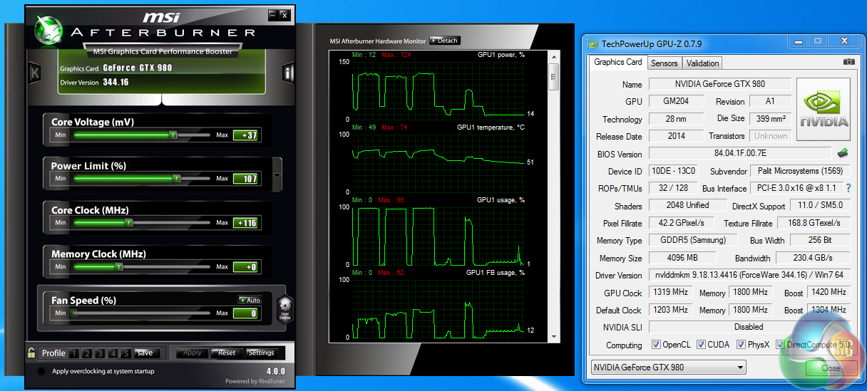 We managed to push the card to 1,319mhz before instability would occur (9.7%). This is a little behind the Asus GTX980 Strix, which peaked at 1,380mhz.