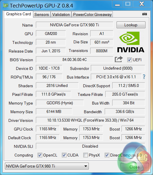 An overview of the hardware in the latest version of GPUz – as discussed on the previous page. This overclocked GM200 core runs at 1165mhz (1,266mhz boost) and is built on the 28nm process. The GTX980 Ti has 96 ROPs, 176 Texture units (Titan X has 192 texture units) and 2,816 CUDA Cores (Titan X has 3,072 CUDA Cores). The 6GB of GDDR5 memory runs at 1753mhz (7Gbps effective) and is connected via a 384 bit memory interface.