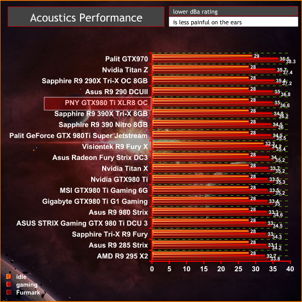 We measure from a distance of around 1 meter from the closed chassis and 4 foot from the ground to mirror a real world situation. Ambient noise in the room measures close to the limits of our sound meter at 28dBa. Why do this? Well this means we can eliminate secondary noise pollution in the test room and concentrate on only the video card. It also brings us slightly closer to industry standards, such as DIN 45635.