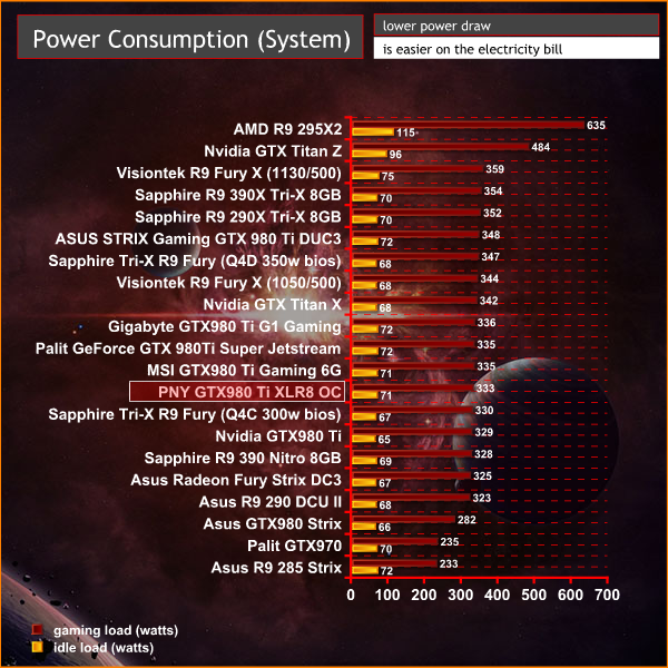 Under gaming load the system consumes 333 watts, which is almost identical to the MSI GTX980 Ti Gaming 6G that we reviewed several weeks ago.