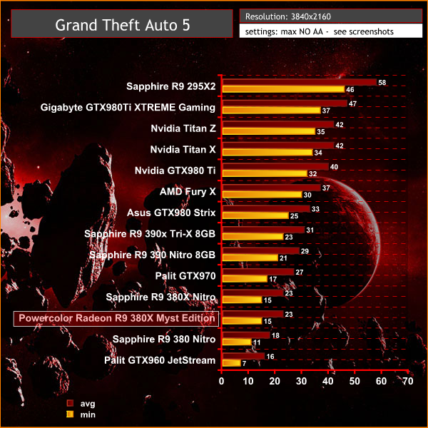 Grand Theft Auto V really needs a GTX980ti or R9 295X2 to get playable frame rates at 4K, especially with these very high image quality settings.