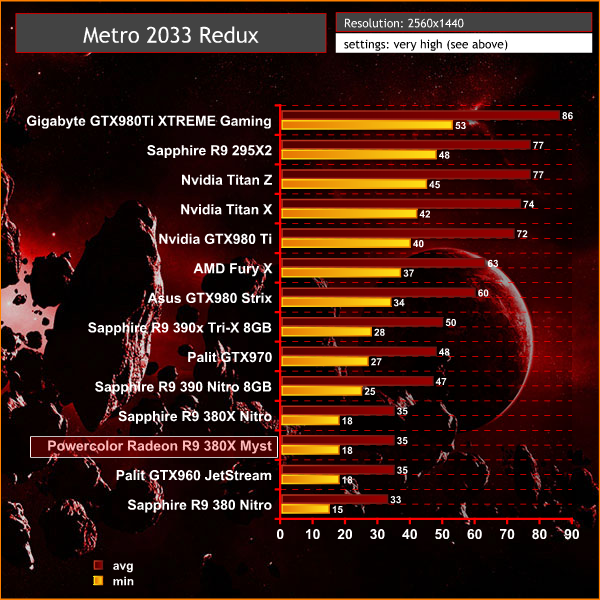 Metro 2033 Redux is a remake of the original game, with enhanced graphics. We often test with Metro Last Light Redux, but decided to mix things around for this review today. We test at 2560×1440 with the following settings: Quality-Very High, SSAA-off, Texture Filtering-16x, Motion Blur-Normal, Tessellation-Normal, Advanced Physx-off.