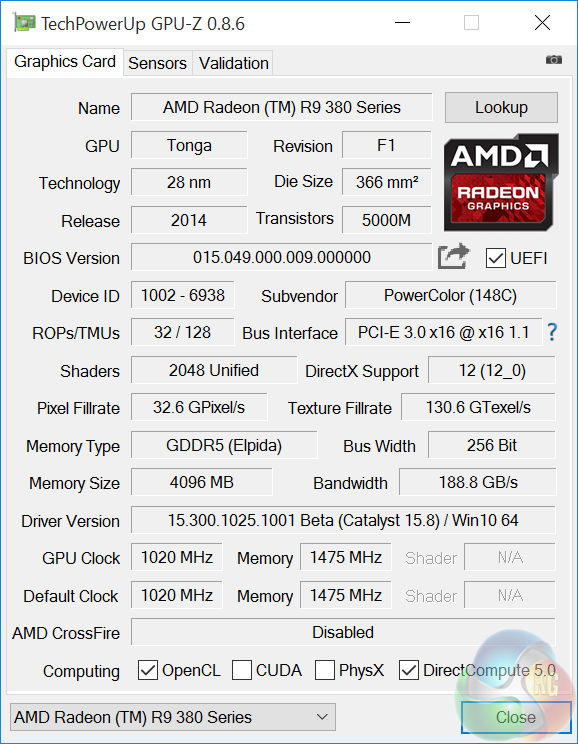 Above, a GPUz overview of the R9 380X hardware which we highlighted in detail on the previous page. We can see the R9 380X is based on the 28nm Tonga core which was originally released in August 2014 and first seen on the R9 285 with our launch review on 2nd September 2014 (HERE).