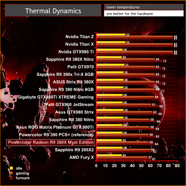 The tests were performed in a controlled air conditioned room with temperatures maintained at a constant 23c – a comfortable environment for the majority of people reading this.Idle temperatures were measured after sitting at the desktop for 30 minutes. Load measurements were acquired by playing Crysis Warhead for 30 minutes and measuring the peak temperature. We also have included Furmark results, recording maximum temperatures throughout a 30 minute stress test. All fan settings were left on automatic.