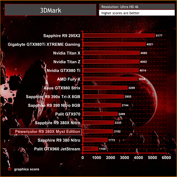 The Powercolor PCS+ Radeon R9 380X Myst Edition 4GB is not really designed to deal with Ultra HD 4k resolutions, however the score is as we would expect – falling in behind the higher clocked Sapphire R9 380X Nitro.