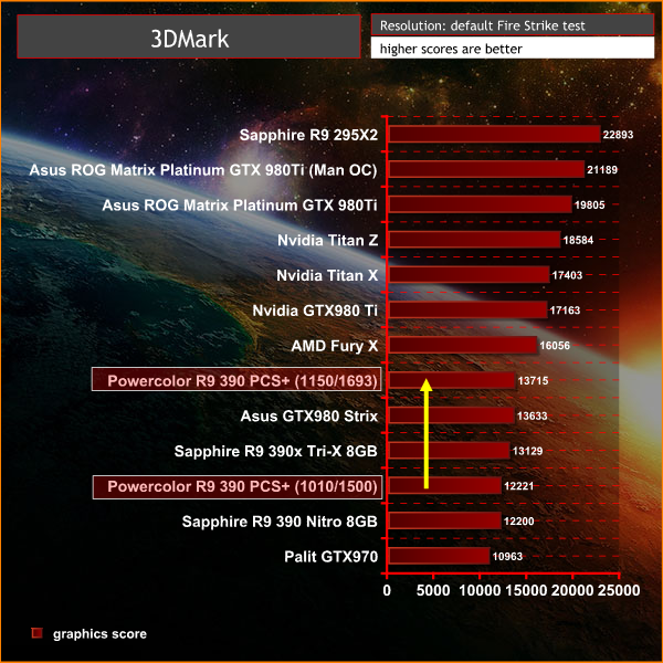 At Ultra HD 4K resolution, the PowerColor Radeon R9 390 PCS+ is around 200 points behind the R9 390X. When overclocked to the limit it manages to slightly outperform the reference clocked R9 390X.