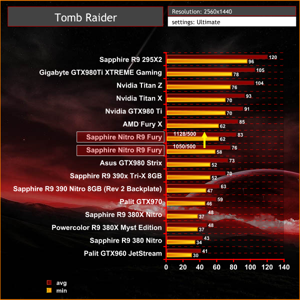 The Sapphire Nitro R9 Fury outperforms the GTX980 at 1440p, even before we manually overclock it to 1,128mhz. At the maximum performance level it is just a couple of frames behind the Fury X.