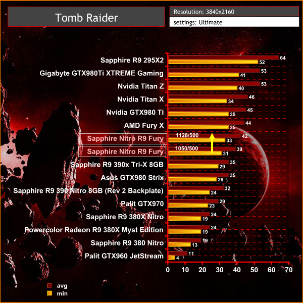 Ultra HD 4K performance is solid, outperforming the GTX980 Strix by a clear margin. At 1,128mhz the frame rates are not too far behind the AMD Fury X.